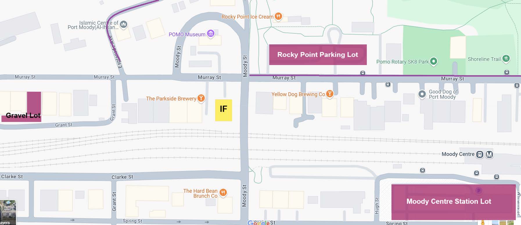The parking lot at Innovative Fitness is prioritized for personal training members. There is ample parking available at Rocky Point, Moody Centre station and along Murray Street.